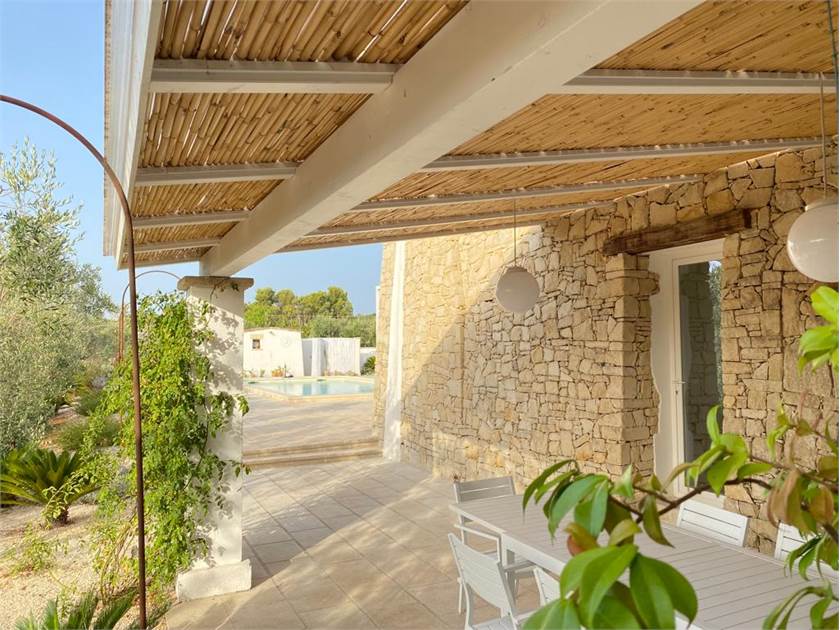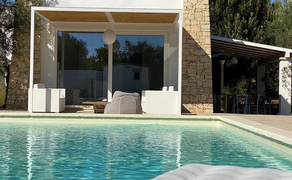 * Un **portico con affaccio sulla piscina**, arredato con comodi divani, ideale per aperitivi al tramonto o piacevoli serate a bordo vasca.