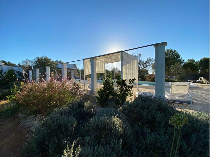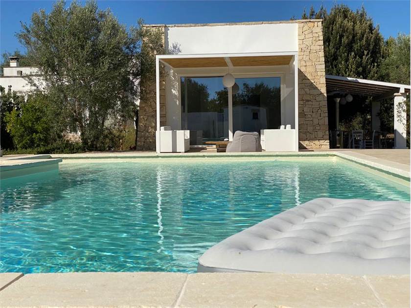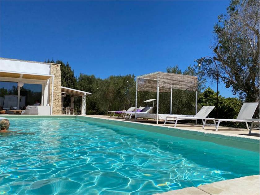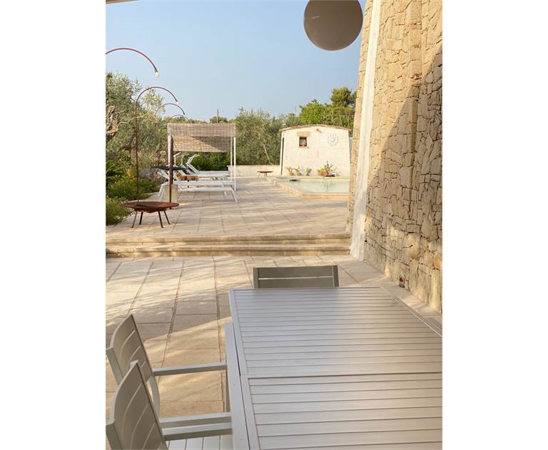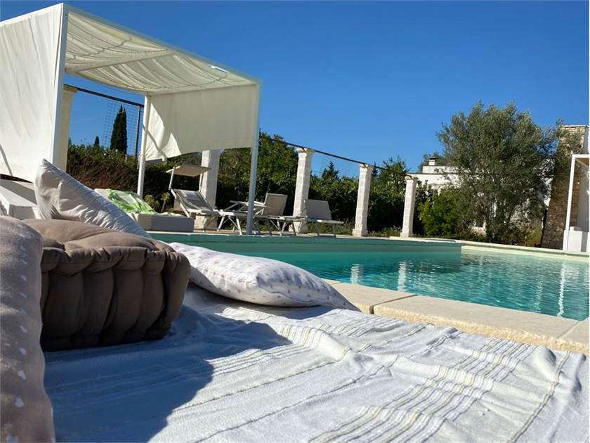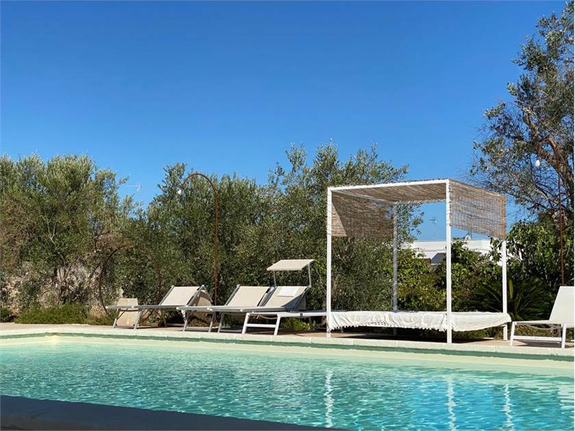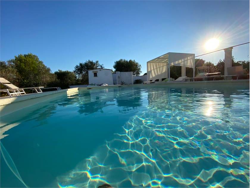 Fiore all'occhiello della proprietà è la **piscina**, che può essere anche ad **uso esclusivo** per garantire la massima privacy. È completamente attrezzata con docce esterne, un bagno dedicato, gazebi, lettini confortevoli e cuscineria, creando un vero e proprio solarium privato dove potervi rilassare sotto il caldo sole salentino.