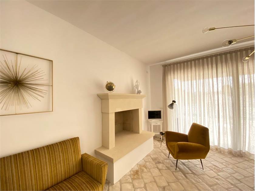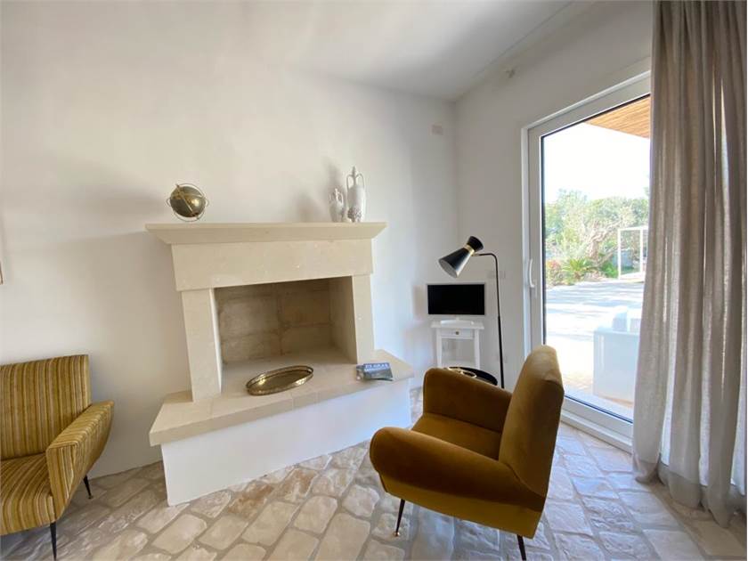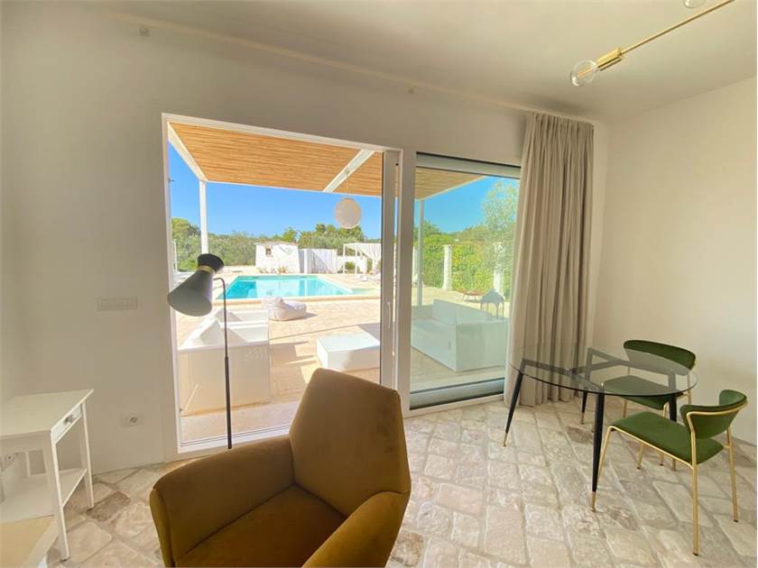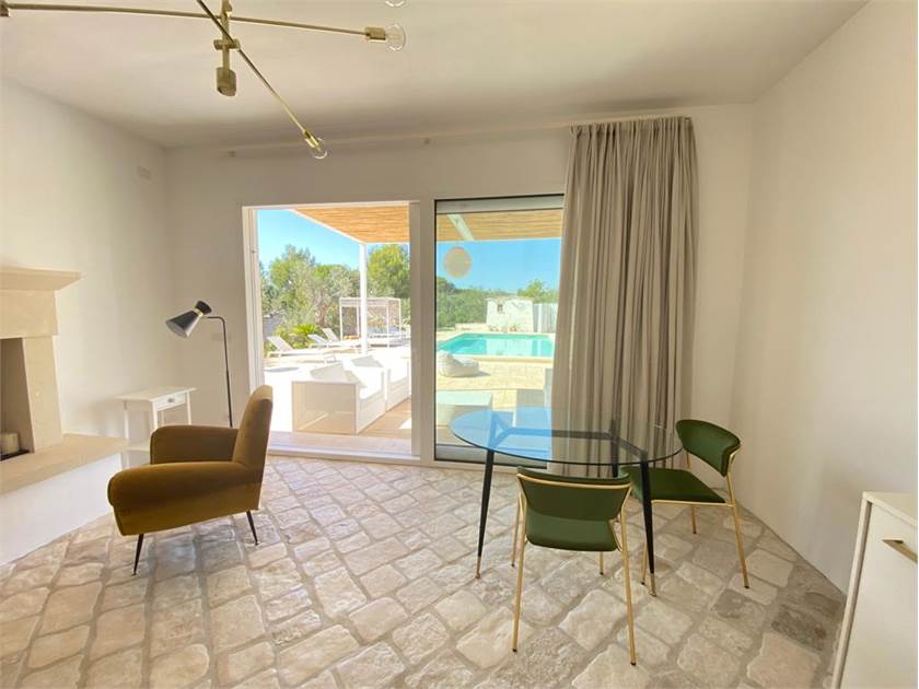 * Un **ingresso/soggiorno open space** vi accoglierà con una grande finestra-vetrata scorrevole che si apre direttamente sulla piscina, creando una continuità incantevole tra interno ed esterno.